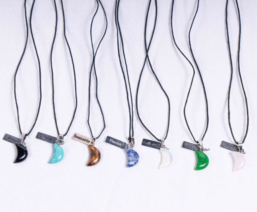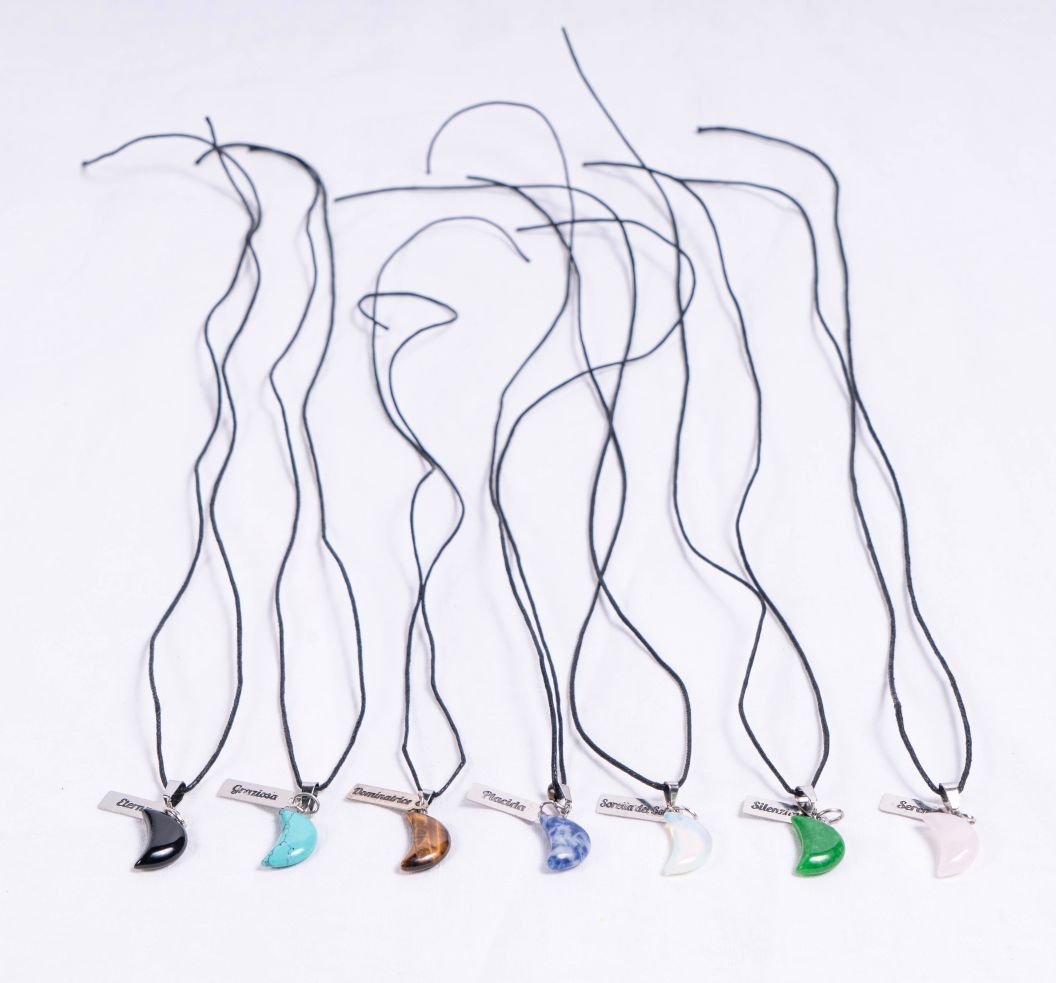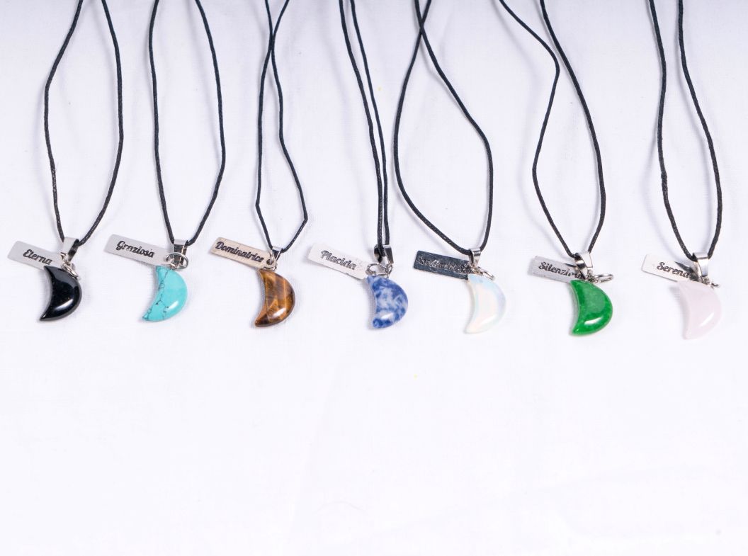 Collana composta da tre parti: cordoncino cerato nero lunghezza 60 cm, ciondolo a forma di mezza luna disponibile in vari tipi di pietra e mini-targhetta con inciso un aggettivo che Giacomo ha riferito alla luna nei Canti. Nella confezione è presente anche un cartoncino dove sono riportate le proprietà della pietra e l’indicazione della poesia da cui è stato tratto l’aggettivo.